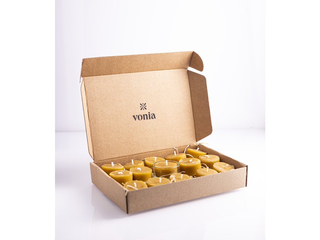 Praktický balíček zerowaste čajových sviečok obsahuje 1 sklenený svietnik + 15 čajových sviečok z včelieho vosku bez hliníkových obalov. Zabalené v papierovej krabičke, vystlanej darčekovou slamou.